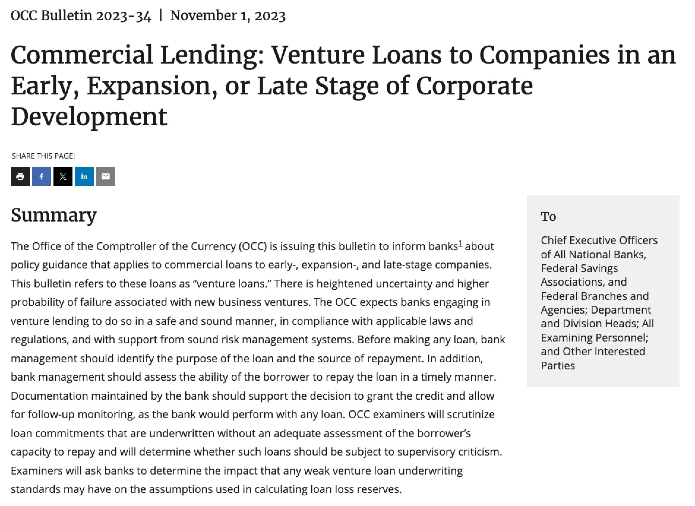 The guidance applies to all national banks and Federal Savings Associations. It relates specifically to commercial lending to what the OCC calls “high-risk, generally venture-backed companies”. While it doesn’t prohibit these types of loans, the bulletin highlights the importance of stress-testing, liquidity risk management, and well-defined underwriting rules for any banks engaging in venture lending.